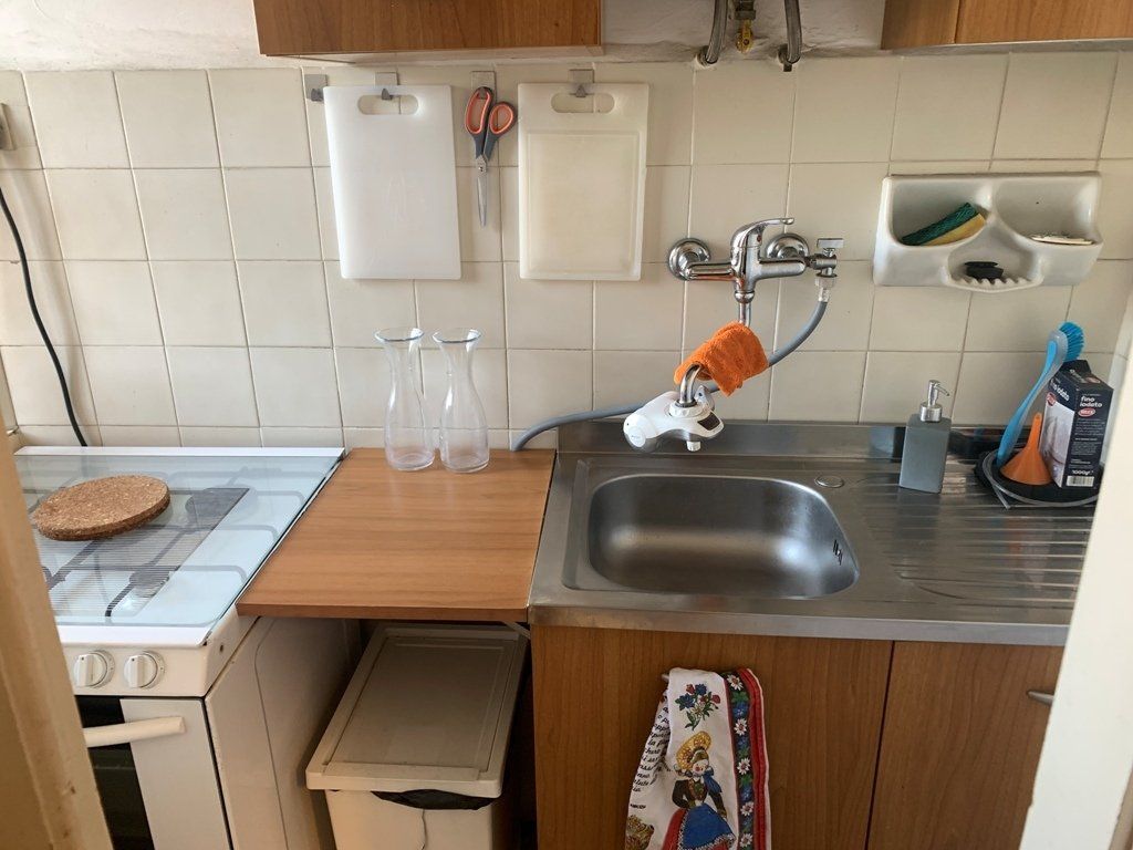 Tinello con cucinino, ripostiglio diviso da cartongesso e porta scorrevole